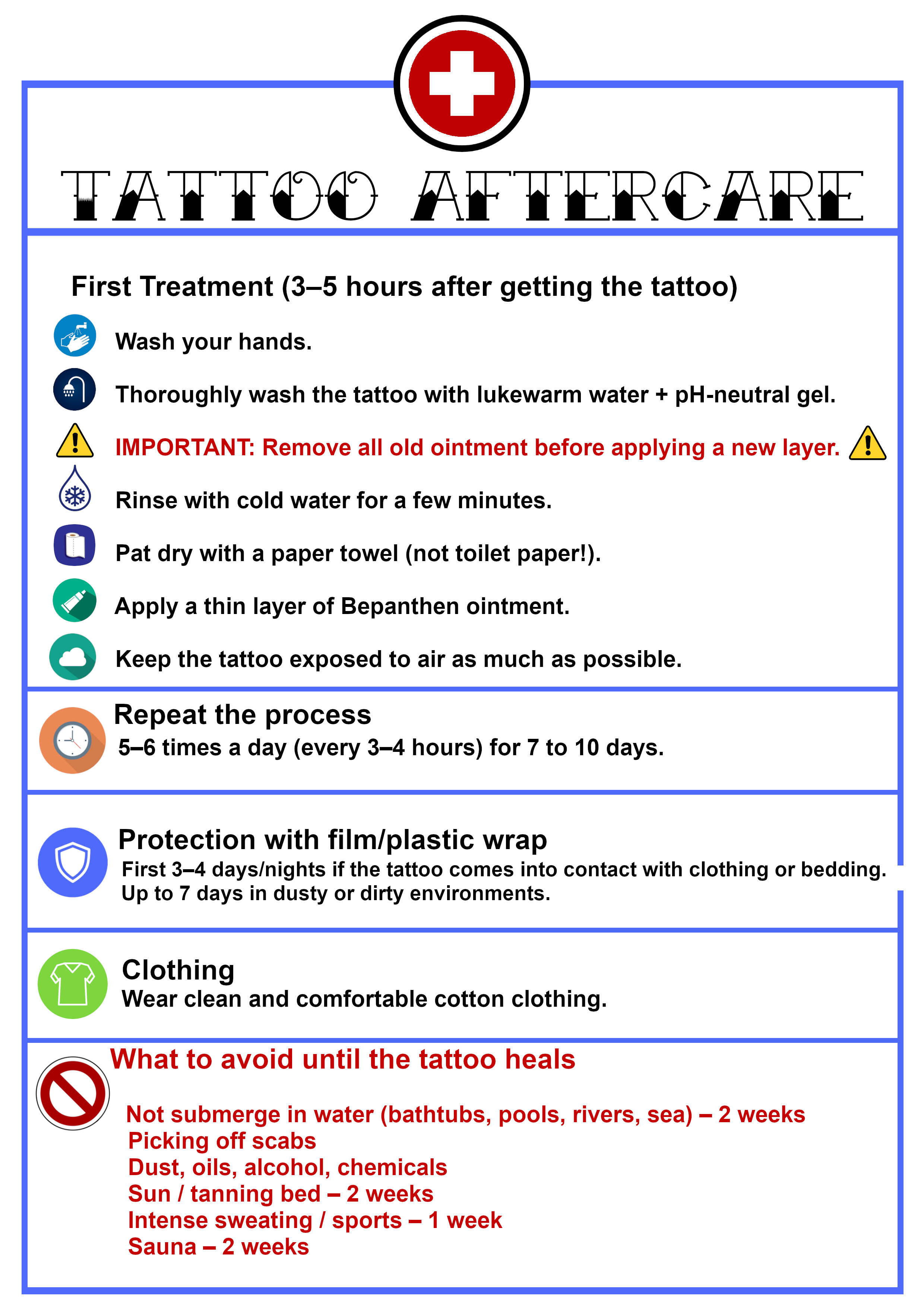 Napomene: Za sve nejasnoće ili dodatne upute o održavanju tetovaže, konzultirajte se sa svojim tattoo artistom. Upute na šabloni su kratke, a vaš tattoo artist će vam dodatno pojasniti i dati personalizirane savjete za aftercare.